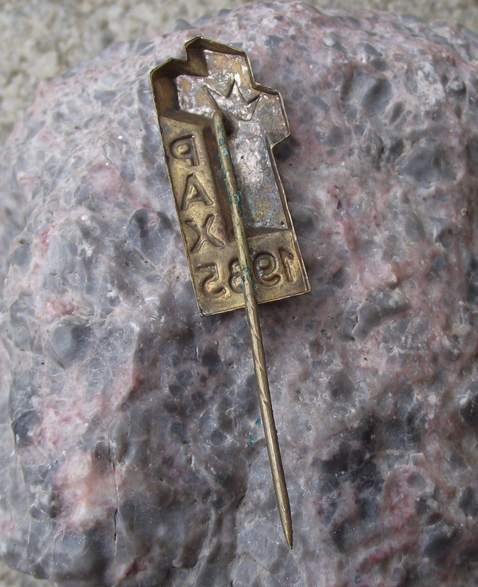 - A 1935, gold coloured metal pin badge with a 3.4cm high badge face and a long stick pin style fastener to the rear.