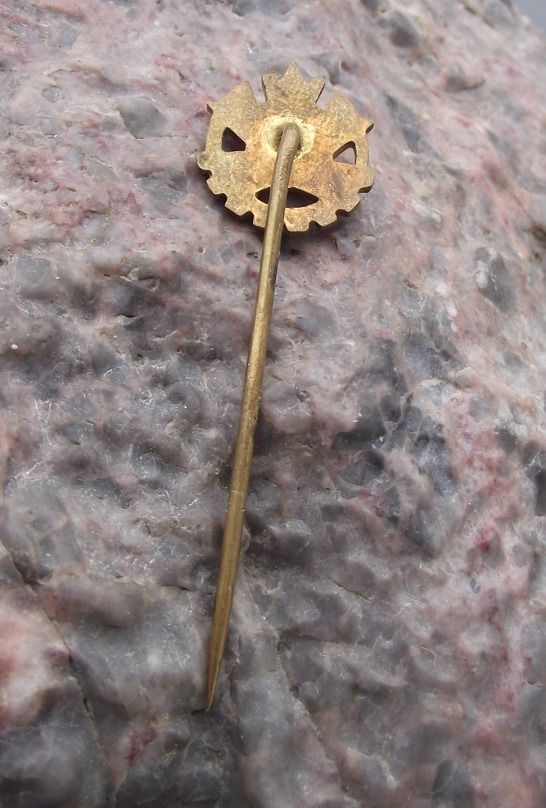 The pin on sale here is a 1950s AVIA logo pin, it is made from gold coloured metal with baked coloured enamel. It has a stick pin fastener and is 1.4cm in diameter.