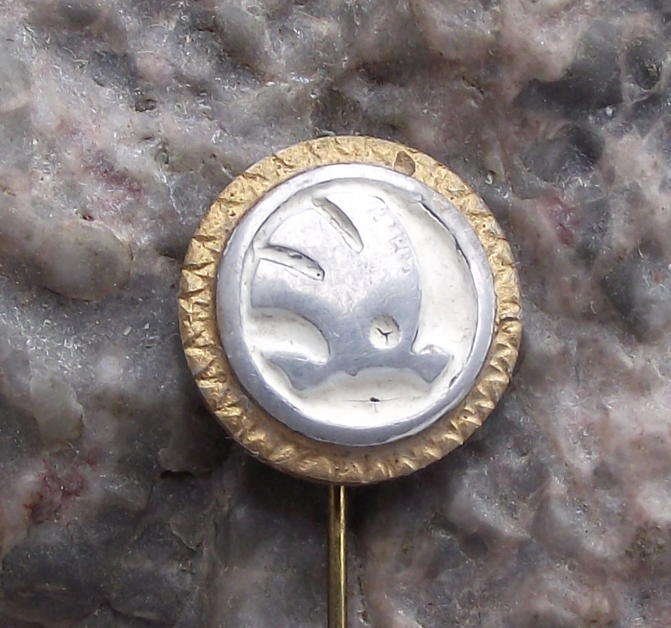 A gold coloured metal pin badge made to advertise Skoda in former Czechoslovakia.