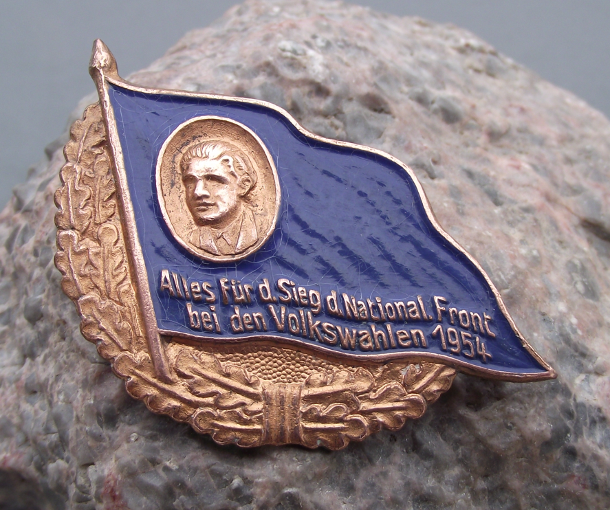 - An excellent metal pin badge from 1954 called the Phillip Muller Medal and made from a dark coloured metal. The badge face is 4.5cm wide and has a safety clasp style fastener to the rear. Featuring the text 'Alles für d. Sieg d. National. Front bei den Volkswahlen 1954' and displaying the FDJ blue flag.