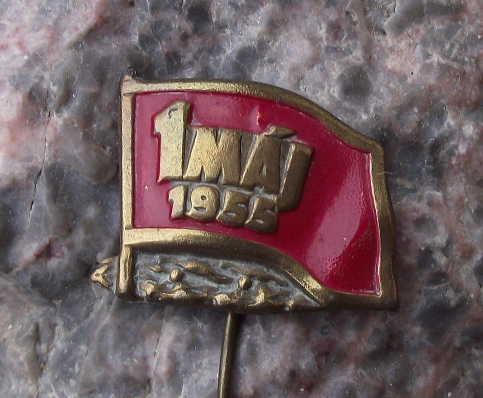- This is a rare gold coloured metal badge from the 1955 May Day celebrations in former Czechoslovakia. It is made from pressed sheet metal and is probably hand painted. Featuring the Red flag of the Soviet Union and the date 1955. Russia had only recently welcomed Czechoslovakia into its sphere of influence in 1948. This is a genuine piece of history and is around 60 years old.