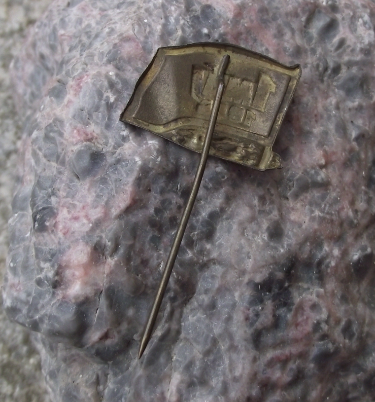 - The badge has a long stick pin style fastener and is 2.5cm wide.