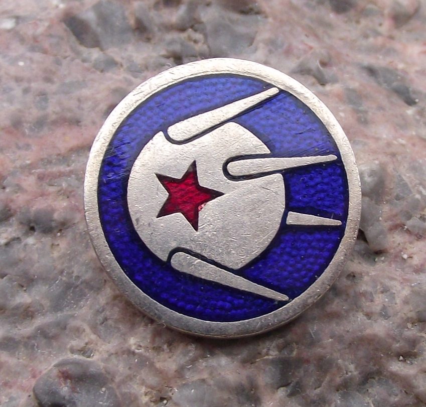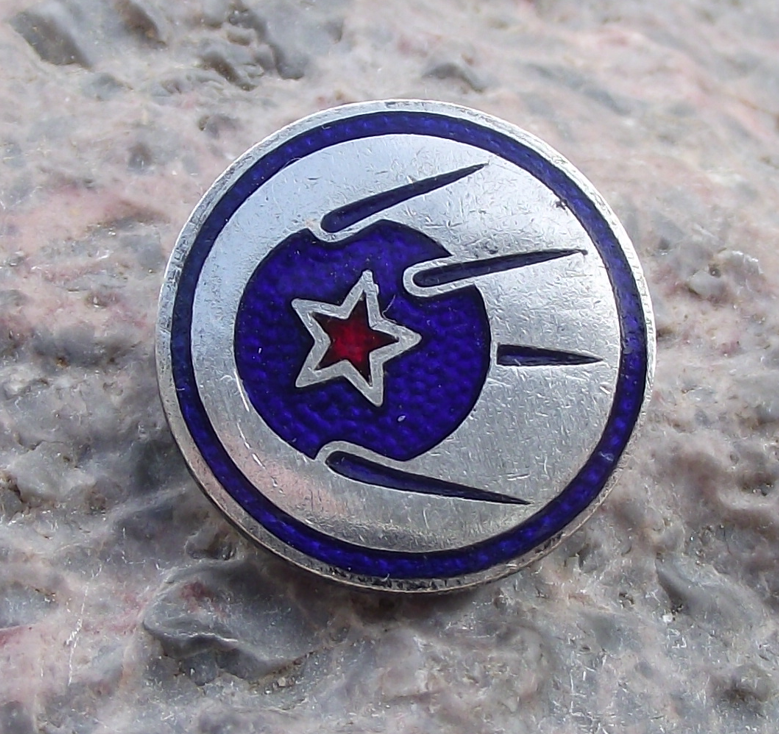 As far as I know this is the oldest of all space mission pin badges. I was made in East Germany in the 1950's to celebrate the success of sputnik 1. It has clear blue and red enamels, which were common in the 1950's but had largely disappeared by 1960 in favour of opaque enamels.