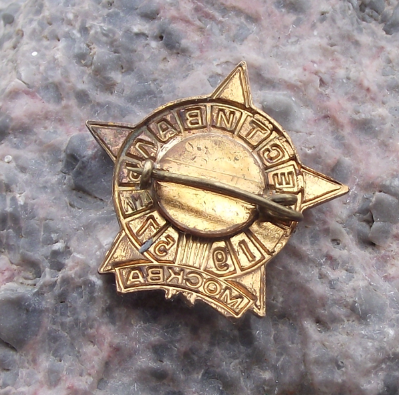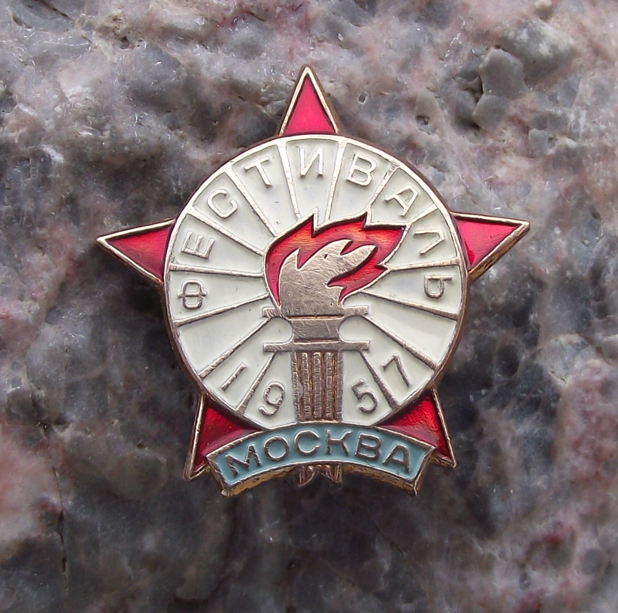 This is an historic pin badge from the 1957 6th World Youth Festival held in Moscow Russia. The text around the pin badge reads ' 1957 FESTIVAL MOSCOW'