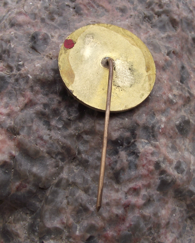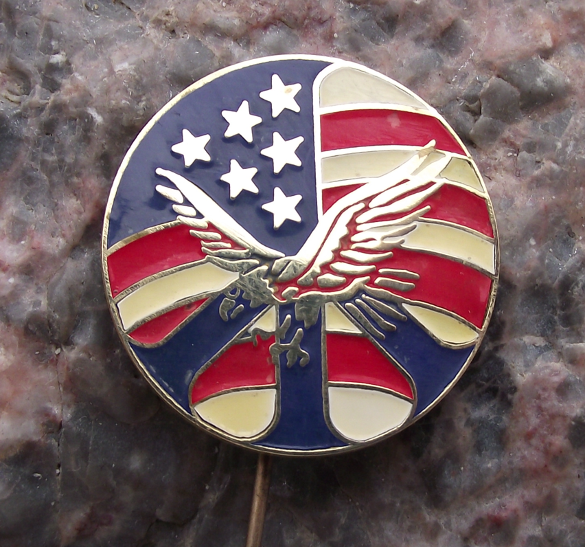- A gold coloured metal badge with a 2.5cm wide badge face and a long, stick pin style fastener to the rear. Featuring the American flag, an eagle and the CND logo.