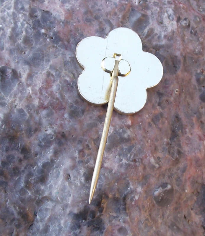 A silver metal badge with a 2cm wide badge face and a long, stick pin style fastener to the rear.