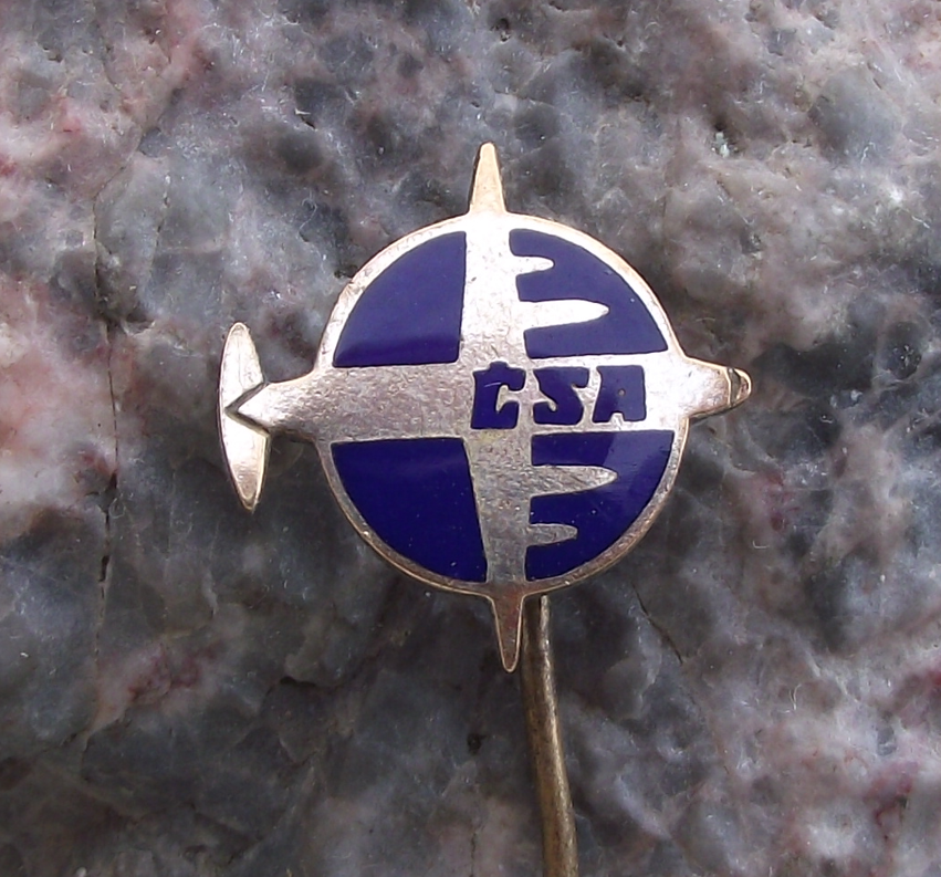 A gold coloured metal, pin badge advertising CSA or Czech airlines and featuring the Ilyushin IL-18 that entered service for CSA in 1960.