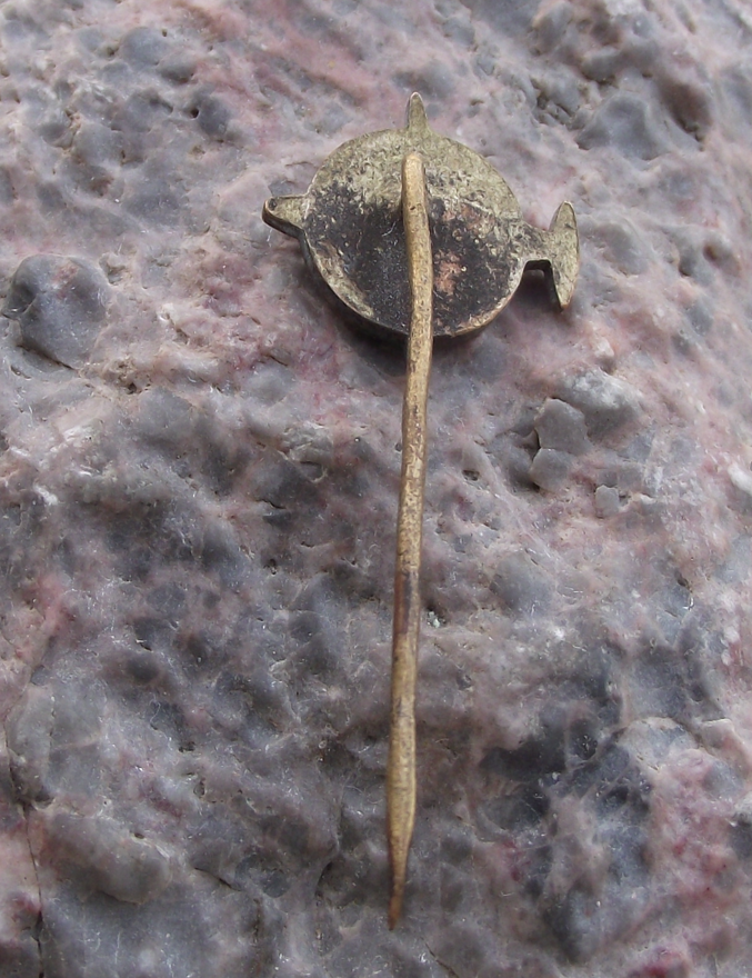 The badge face is 1.7cm wide and has a long, stick pin fastener.