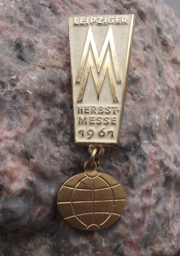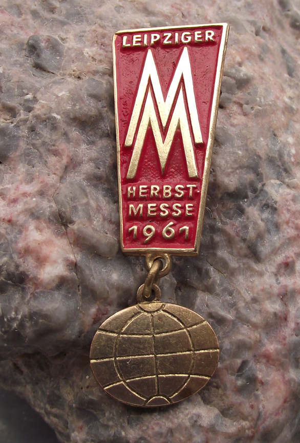 - A 1961 pin badge from the Leipzig trade fair, it is made of metal and has a safety clasp style fastener to the rear. The badge face is 4.8cm high and features the MM logo.