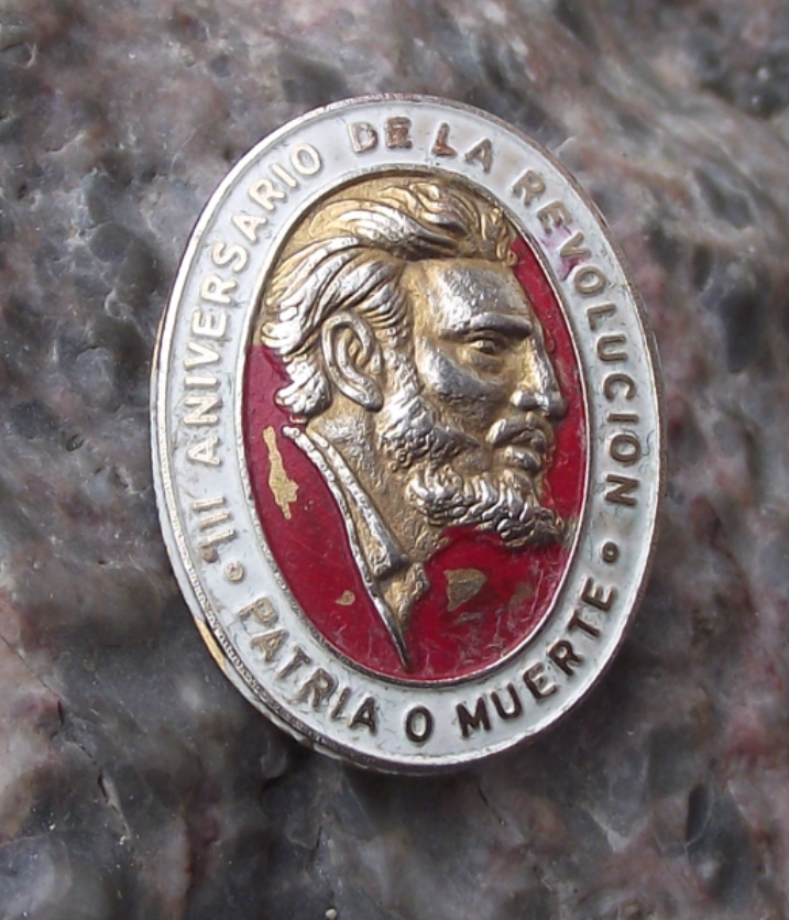 - The badge features the Cuban national slogan PATRIA O MUERTE - Homeland or Death and the face of Fidel Castro.