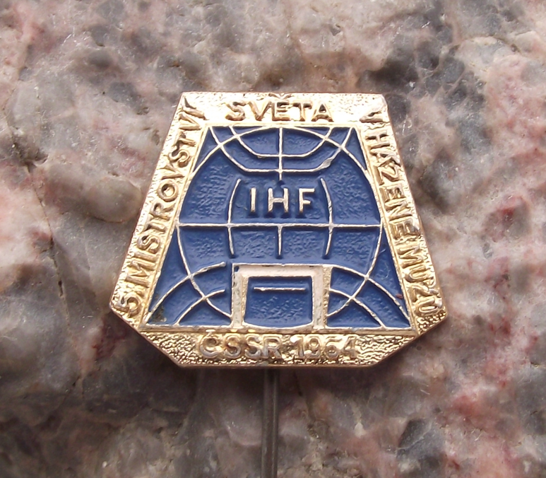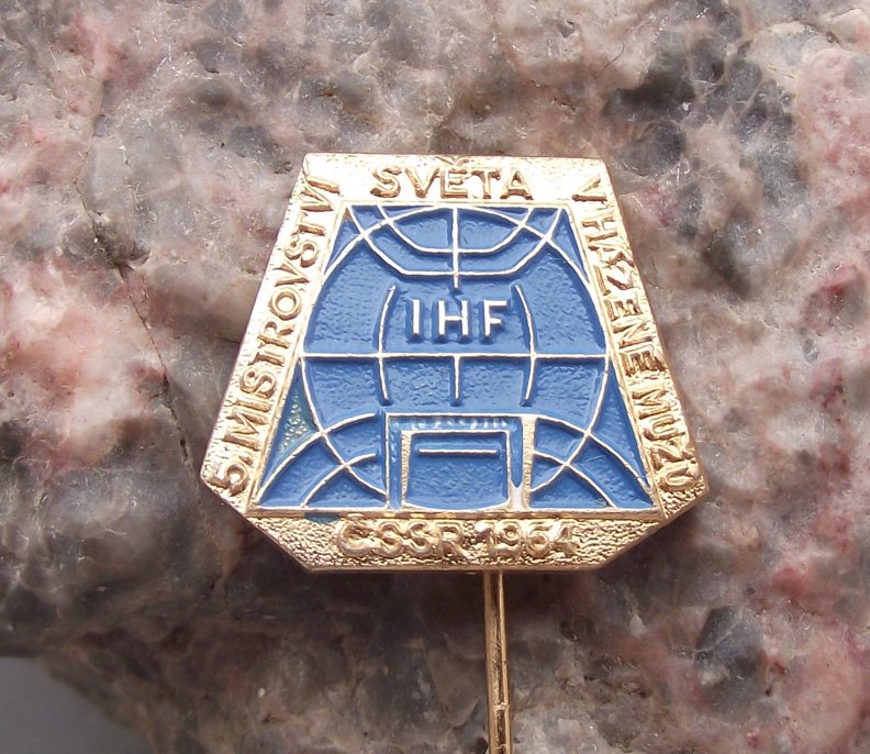 - A very pretty, 1964 pin badge from the handball Association of Czechoslovakia, made for the 1964 IHF Handball World Championships held in former Czechoslovakia. It is made from a gold coloured metal. The badge face is 2cm wide and has a long, stick pin fastener to the rear.