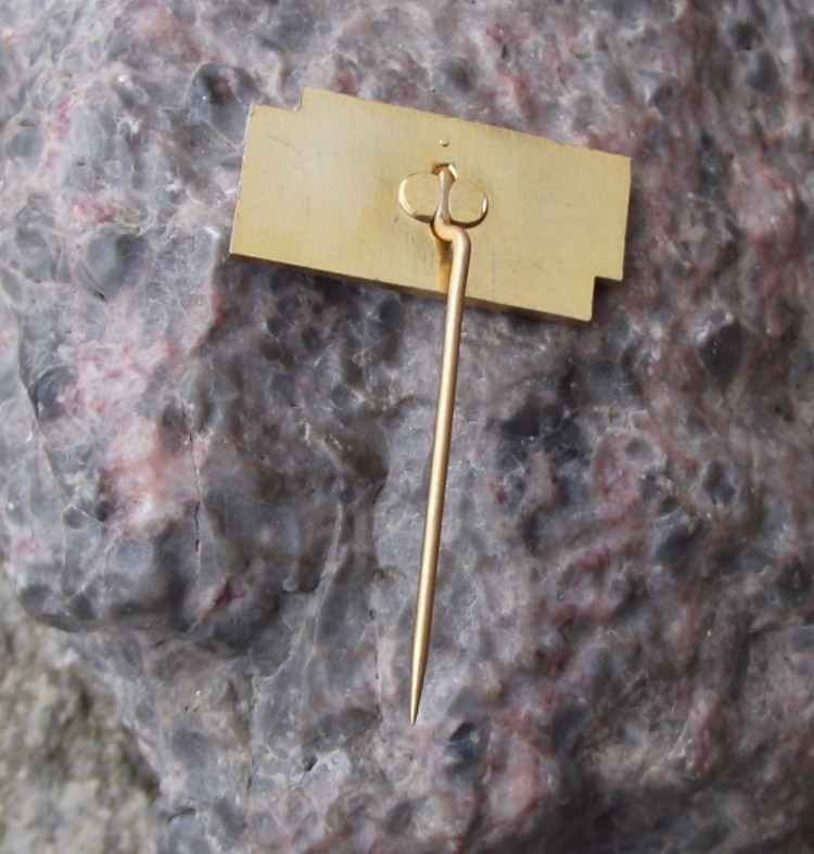 A 1965 gold coloured metal spartakiad pin from former Czechoslovakia, it is 2.8cm wide and has a long pin style fastener to the rear. Featuring the logo for the 1965 event an athlete with raised arms and parted legs.