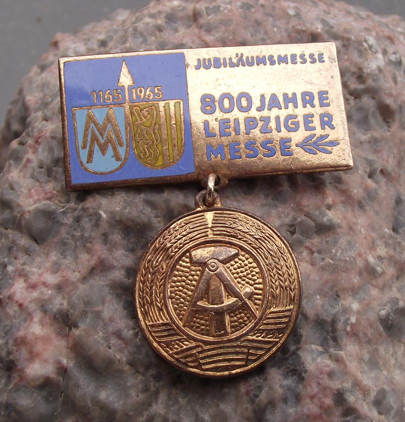 - A 1965 pin badge from the Leipzig trade fair, it is made of metal and has a safety clasp style fastener to the rear. The badge face is 3.7cm wide and features the text 800th Anniversary.
