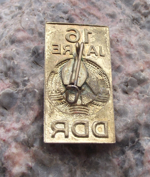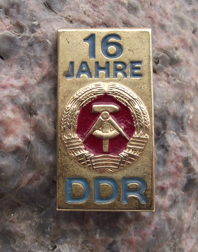 - This pin badge celebrates the 16th anniversary of East Germany in 1965, it is made from a silver coloured metal and has a safety clasp style fastener to the rear. The badge face is 3.2cm high.