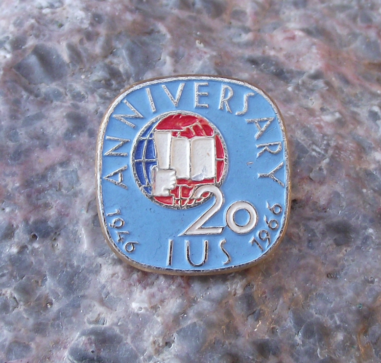 - A pretty 1966 silver coloured metal pin badge from the 20th anniversary of the IUS.