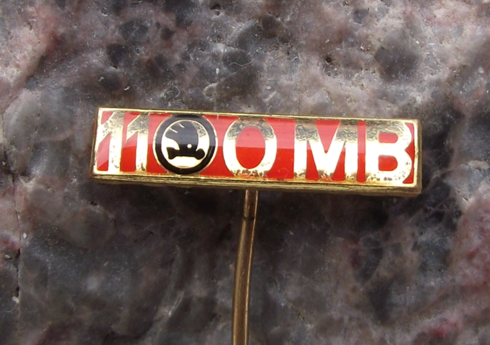 A golden coloured metal and enamel pin badge made in 1966 to celebrate the launch of the very successful Skoda 1100MB