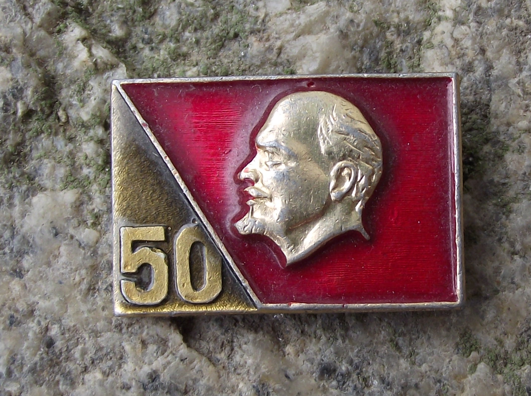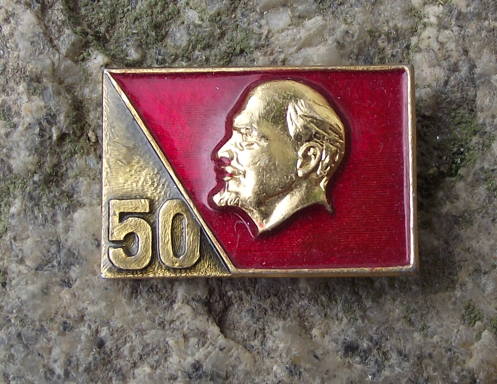 - An pretty, gold coloured metal pin badge. The badge face is 2.4cm wide and has a safety clasp style fastener to the rear. Featuring the number 50 and the face of Lenin, it celebrates the 50th anniversary of the October Revolution and the formation of the Soviet Union.