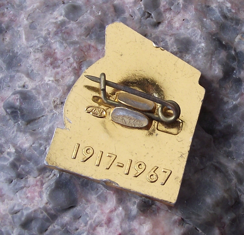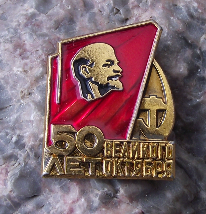 - An pretty, gold coloured metal pin badge. The badge face is 2.4cm high and has a safety clasp style fastener to the rear. Featuring the number 50 and the face of Lenin on a red flag, it celebrates the 50th anniversary of the October Revolution and the formation of the Soviet Union.