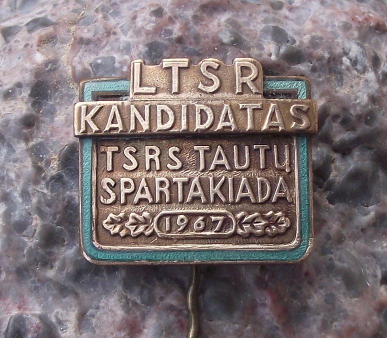 The face has the text LTSR which is the Socialist Republic of Lithuania when it was part of the Soviet Union. - The pin advertises that the wearer is a candidate for the Spartakiad games in 1967.