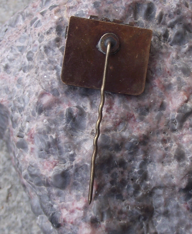 - A gold coloured metal badge with a 2.2cm wide face and a long, stick pin style fastener to the rear.