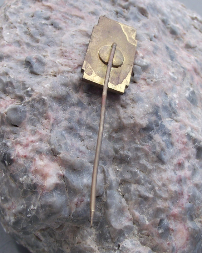 - The badge has a long stick pin style fastener and is 1.9cm high.