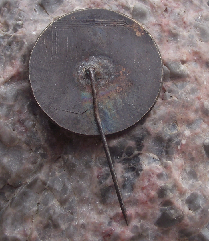 - A pretty, gold coloured metal pin badge with a long stick pin style fastener to the rear. The badge face is 2.5cm high.