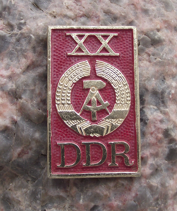 - This pin badge celebrates the 20th anniversary of East Germany in 1969, it is made from a silver coloured metal and has a safety clasp style fastener to the rear. The badge face is 3.2cm high.