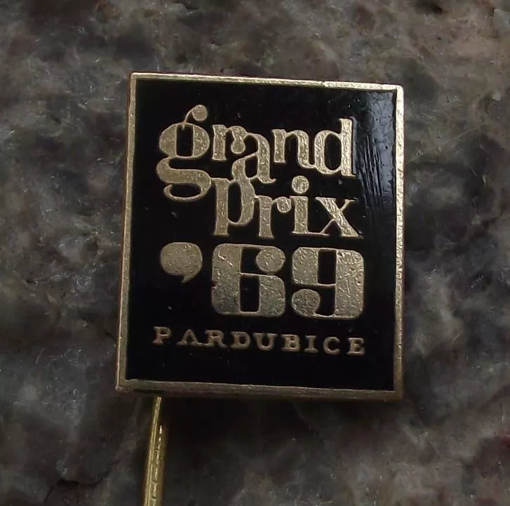 The badge face is 1.5cm high and has a long, stick pin style fastener to the rear. The text on the badge face reads 'Grand Prix '69 Pardubice'.