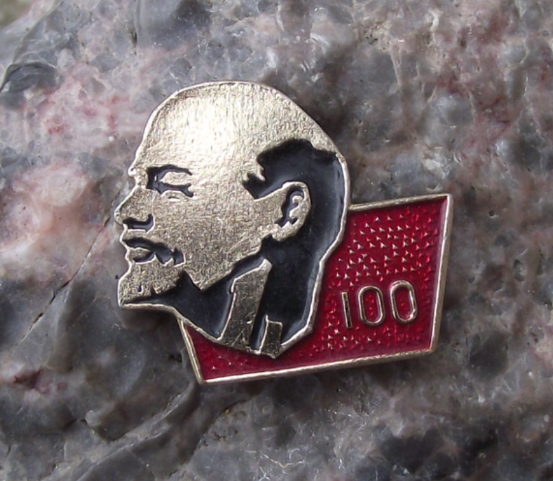 - A Lenin centenary pin badge, 2.3cm wide, made of a silver coloured metal and featuring a Lenin profile and the number 100 with a clasp style fastener to the rear.