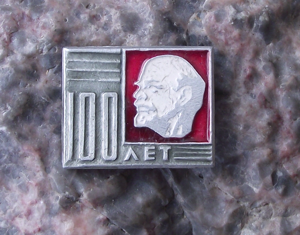 - A Lenin centenary pin badge, 2cm wide, made of a silver coloured metal and featuring a Lenin profile and the text '100 YEARS' with a clasp style fastener to the rear.