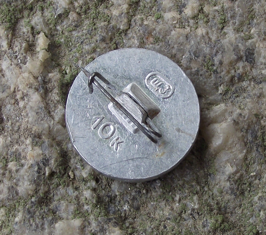 - This round badge is 1.6cm in diameter and made from a silver coloured metal with a safety clasp style fastener to the rear.