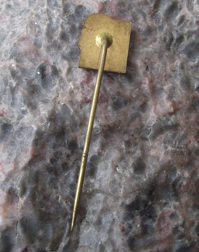 - A gold coloured, metal badge 1.2cm high with a long stick pin style fastener to the rear.