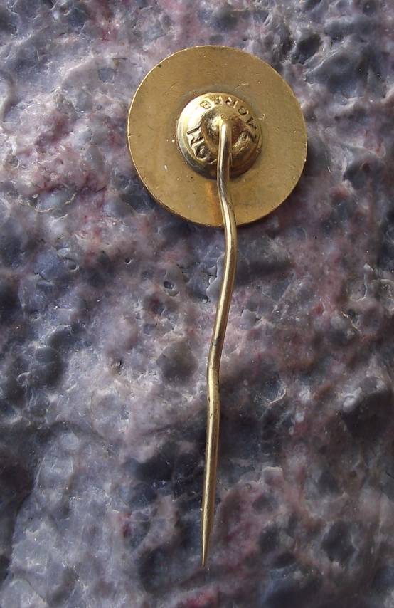 The badge face is 1.6cm wide and has a long, stick pin fastener.