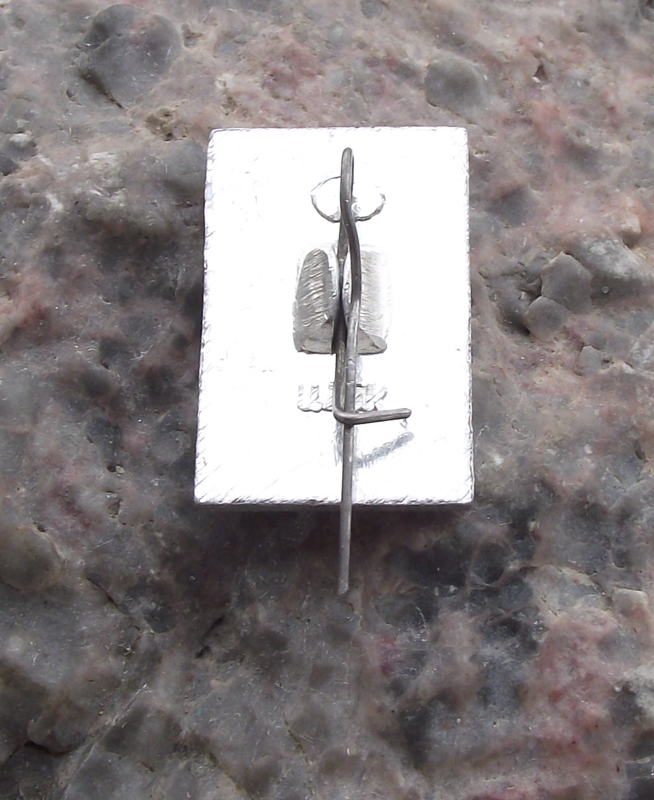 - A silver coloured, metal badge 1.9cm high with a safety clasp style fastener to the rear.