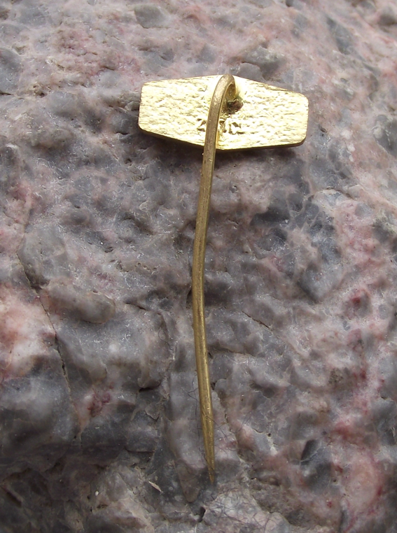 A gold coloured metal badge with 1.6cm wide badge face and a long, stick pin fastener to the rear.