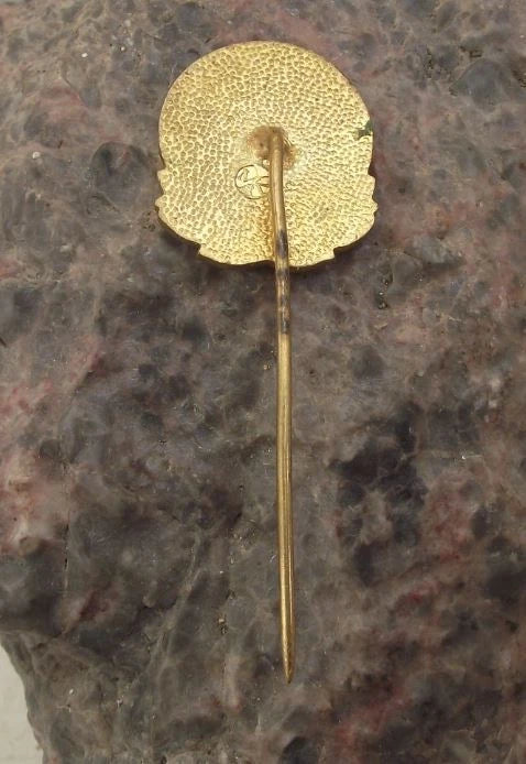 A pretty 1972 souvenir pin badge from the Czech Railway Company. The badge face is 2cm wide , made from a gold coloured metal and has a stick pin fastener to the rear.