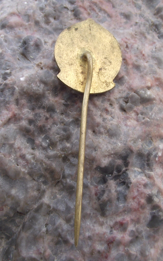 A vintage pin badge from the Czech Railway Company, CSD. The badge face is 1.9cm high, made from a gold coloured metal and has a stick pin fastener to the rear.