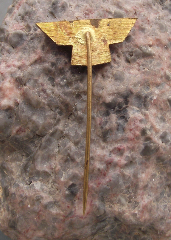 A 1972 vintage pin badge from the Czech Railway Company, CSD. The badge face is 2.7cm wide, made from a gold coloured metal and has a stick pin fastener to the rear.