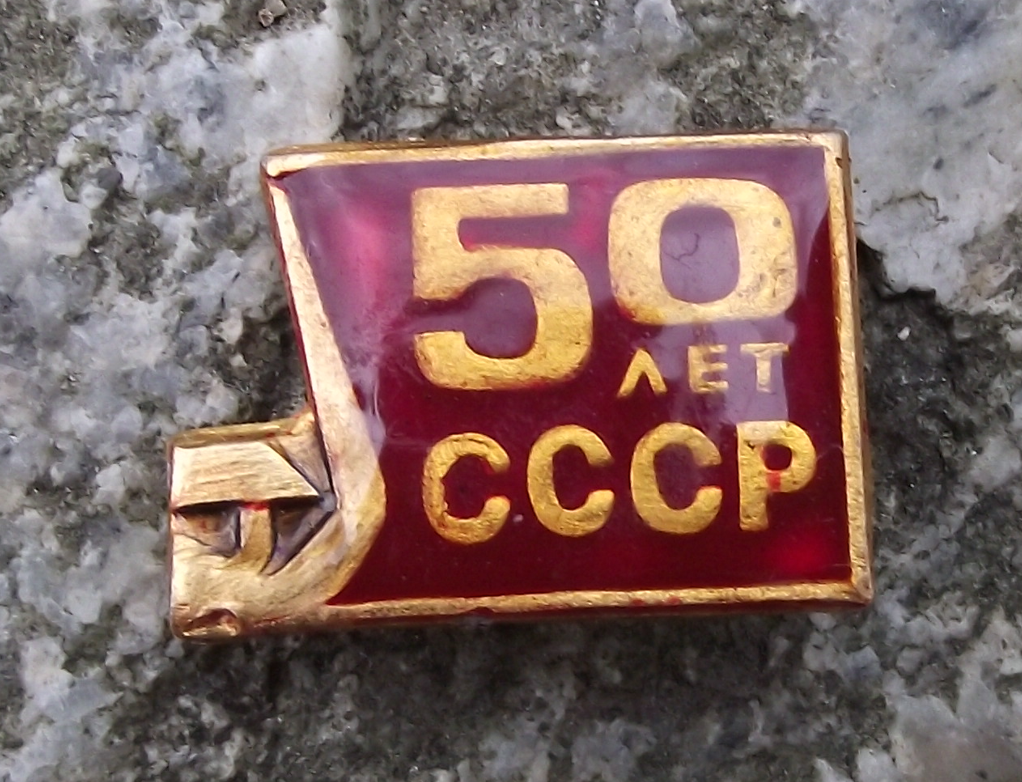A collectible pin badge celebrating the 50th anniversary of the formation of the Soviet Union.
