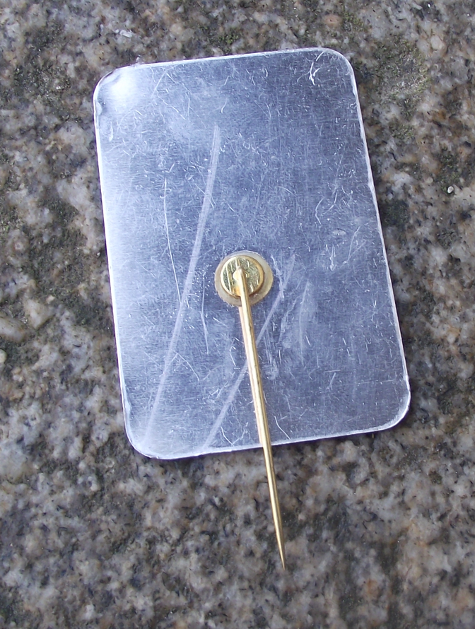- A silver coloured metal pin badge 6cm high with a long stick pin style pin fastener to the rear.