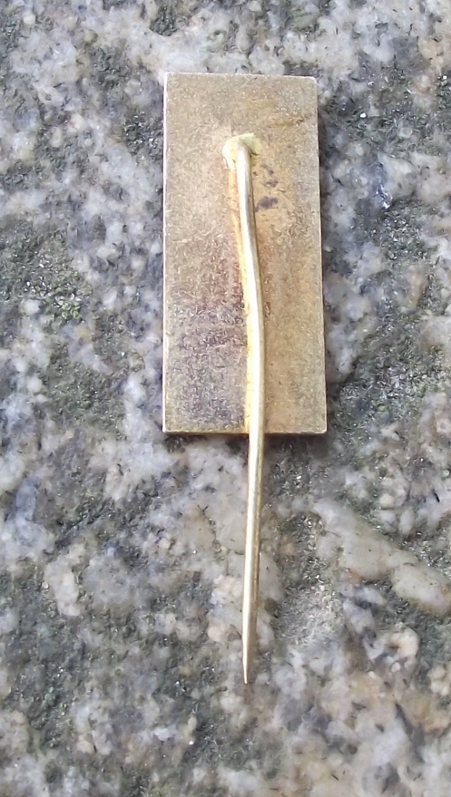- A gold coloured metal pin badge 2.8cm high with a long stick pin style pin fastener to the rear.