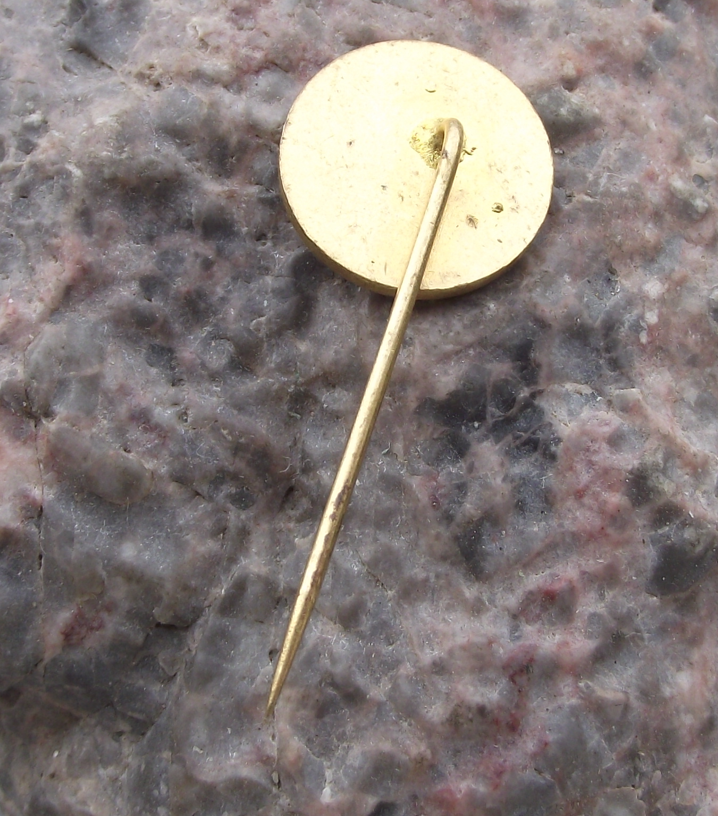 The badge face is 1.5cm wide and has a long, stick pin fastener.