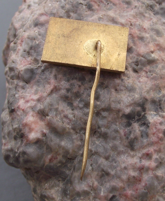 - A pretty, communist youth pin badge with a 2.3cm wide badge face, made of a gold coloured metal with a long stick pin style fastener to the rear.