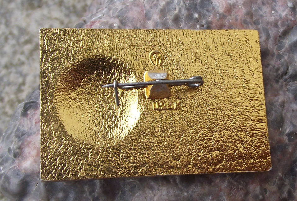 - This badge is 4.2cm wide and made from a gold coloured metal with a safety clasp style fastener to the rear.