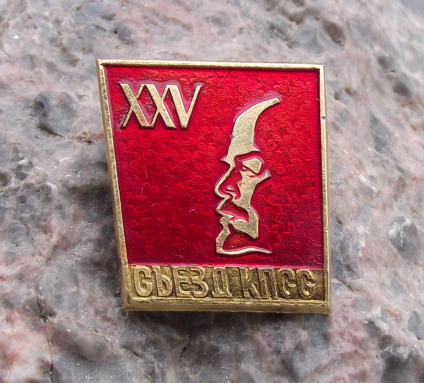 - A collectible pin badge from the 25th Sjezd (conference) of the Congress of the Communist Party of the Soviet Union. Featuring the Roman numerals XXV and the initials KNCC which stands for Коммунистической партии Советского Союза.