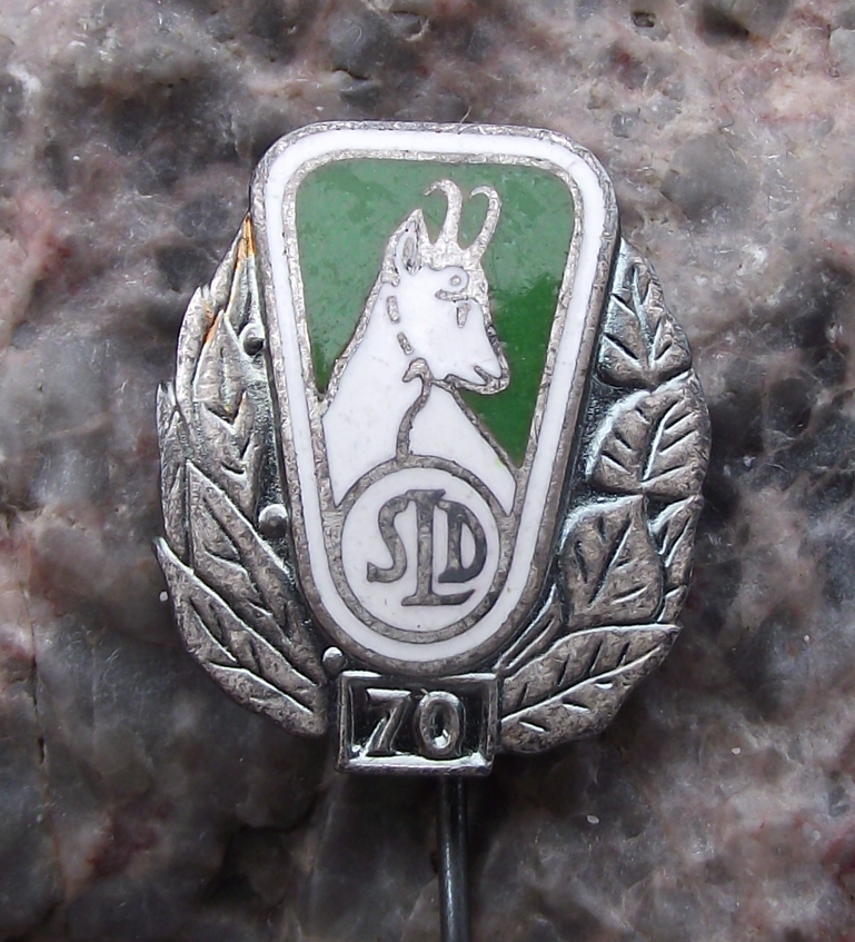 - A 1979 silver coloured metal hunting themed pin from Slovenia, the badge face is 2.1cm high and has a long, stick pin style fastener to the rear. Featuring the initials SLD which is the 'Slovensko lovsko društvo' or Hunting Union Slovenia and the number 70.