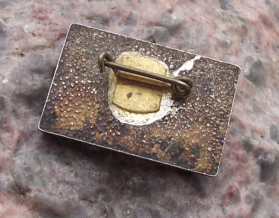 Made from a silver coloured metal. The badge face is 2.6cm wide and has a safety clasp style fastener to the rear.