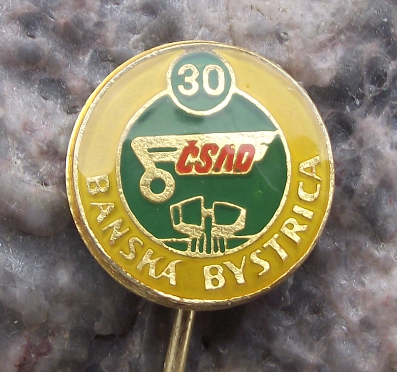 The badge advertises the 30th anniversary of the state owned bus company in the city of Banska Bystrice and features the building of the Museum of Slovak National Uprising