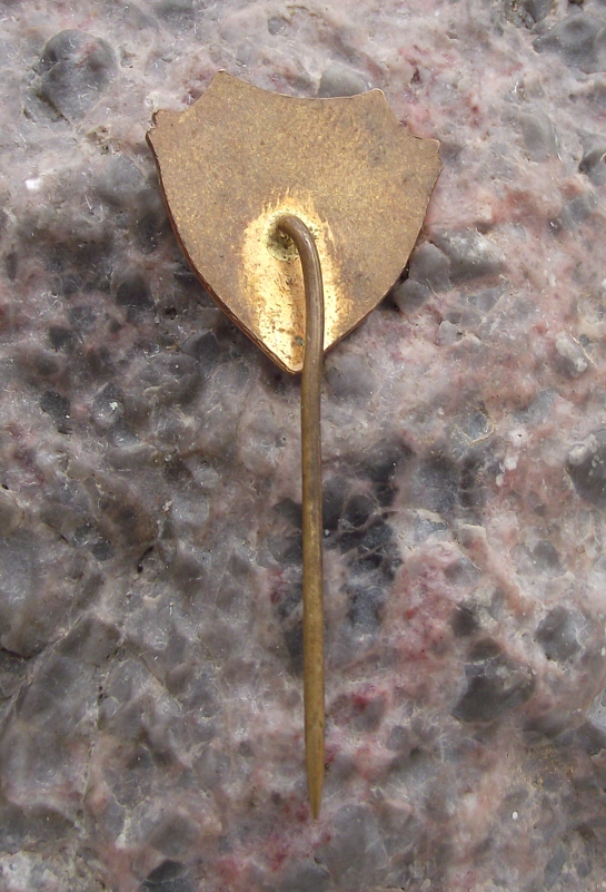 A 1979 vintage pin badge from the Czech Railway Company, CSD. The badge face is 1.9cm high, made from a gold coloured metal and has a stick pin fastener to the rear.