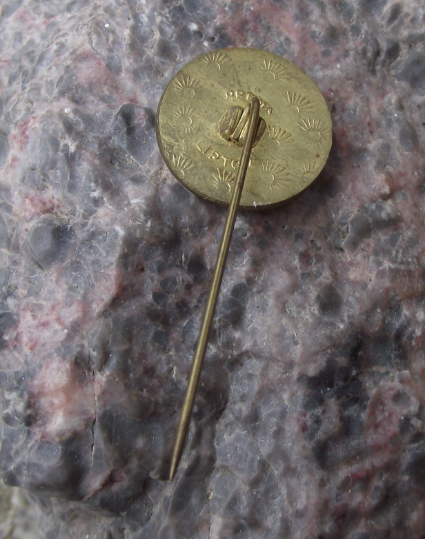 - The badge has a long stick pin style fastener and is 1.8cm wide.